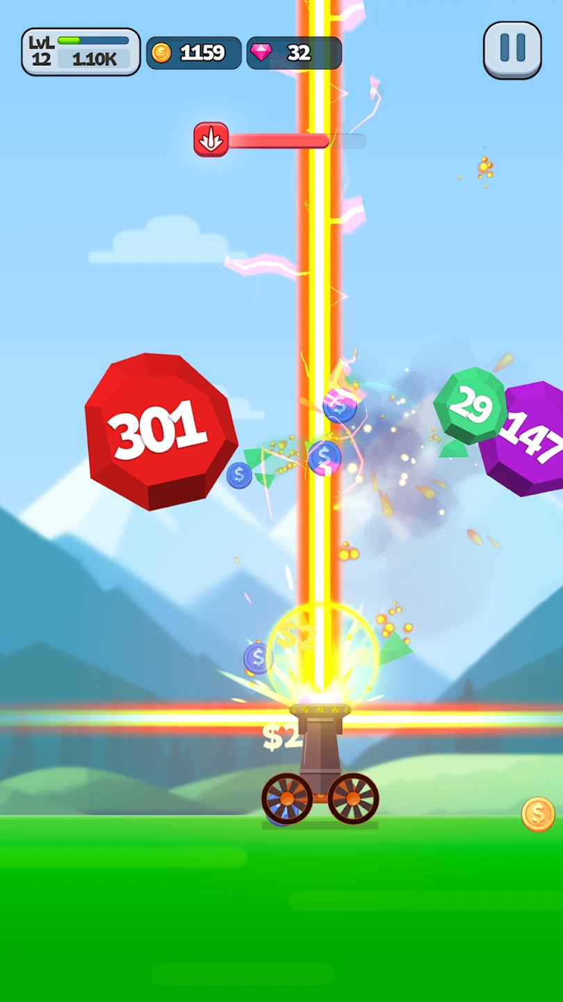 • Step 3: Your score increases with each object destroyed. Tap the “Upgrade” button to buy new ball types or aim modes. Complete levels within the time limit to score higher and unlock new game modes.