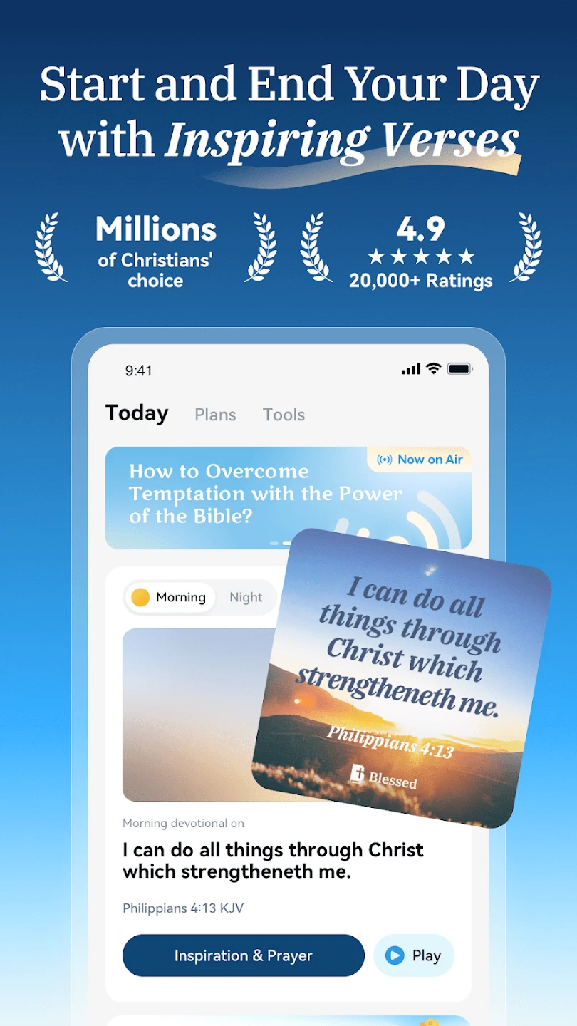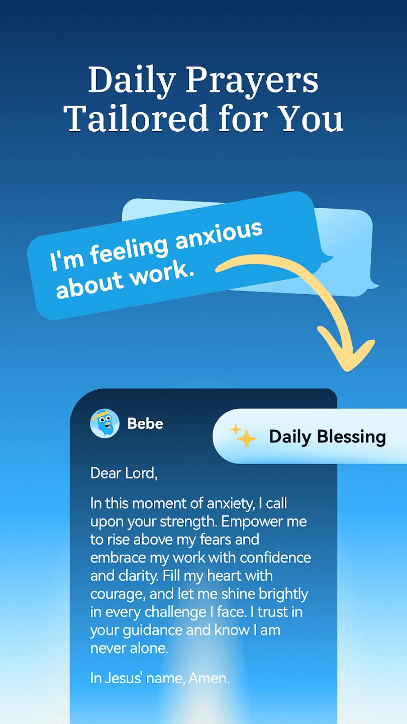 - Guided Prayers and Prayers Database: Access a collection of common prayers themed by situations (like gratitude, forgiveness, stress) alongside customizable options, providing emotional support and ready-made devotional content for immediate spiritual comfort or quiet time. For instance, someone feeling anxious can quickly select a calming prayer, receiving tailored guidance quickly.