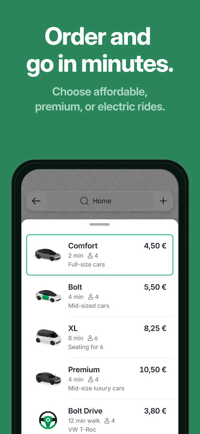 • Wide Vehicle Selection: Choose from various vehicle categories such as Bolt Express (economy), Bolt Standard, Bolt Premium, Bolt Large, Bolt Van, or Bolt Cargo, depending on passenger capacity, cargo needs, or specific requirements. This extensive range makes Bolt suitable for everything from solo commutes to group transport and specialized deliveries, addressing a broad spectrum of transportation needs with one service provider.