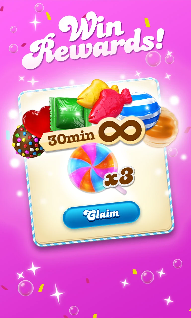 • [Any Special Systems]: The game incorporates features like “Spins” (currency for making random swaps), “Soda Boosters” that enhance Soda Maker fills, and regular seasonal “Candy Crush Worlds” events, which unlock special worlds filled with unique challenges and rewards, boosting engagement and providing fresh content.