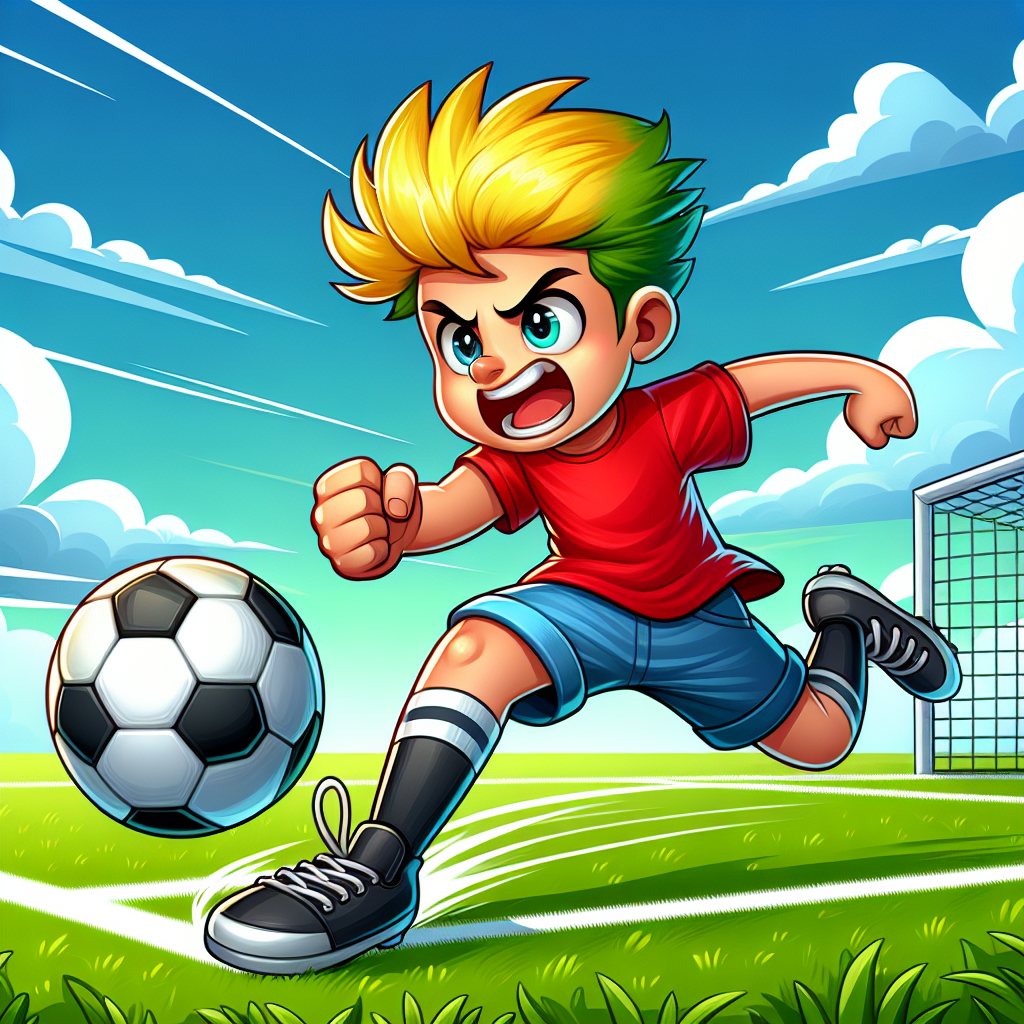 A cartoon-style boy with spiky yellow hair, wearing a red shirt and blue shorts, is playing football. He is in the middle of a grassy field, passionately kicking a black and white soccer ball towards an imaginary goal post. He has a challenging look on his face, highlighting the competitive spirit of the game. A vibrant sky with fluffy white clouds hangs overhead, complementing the energetic scene taking place on the green field. It’s a moment full of action and sporty excitement.