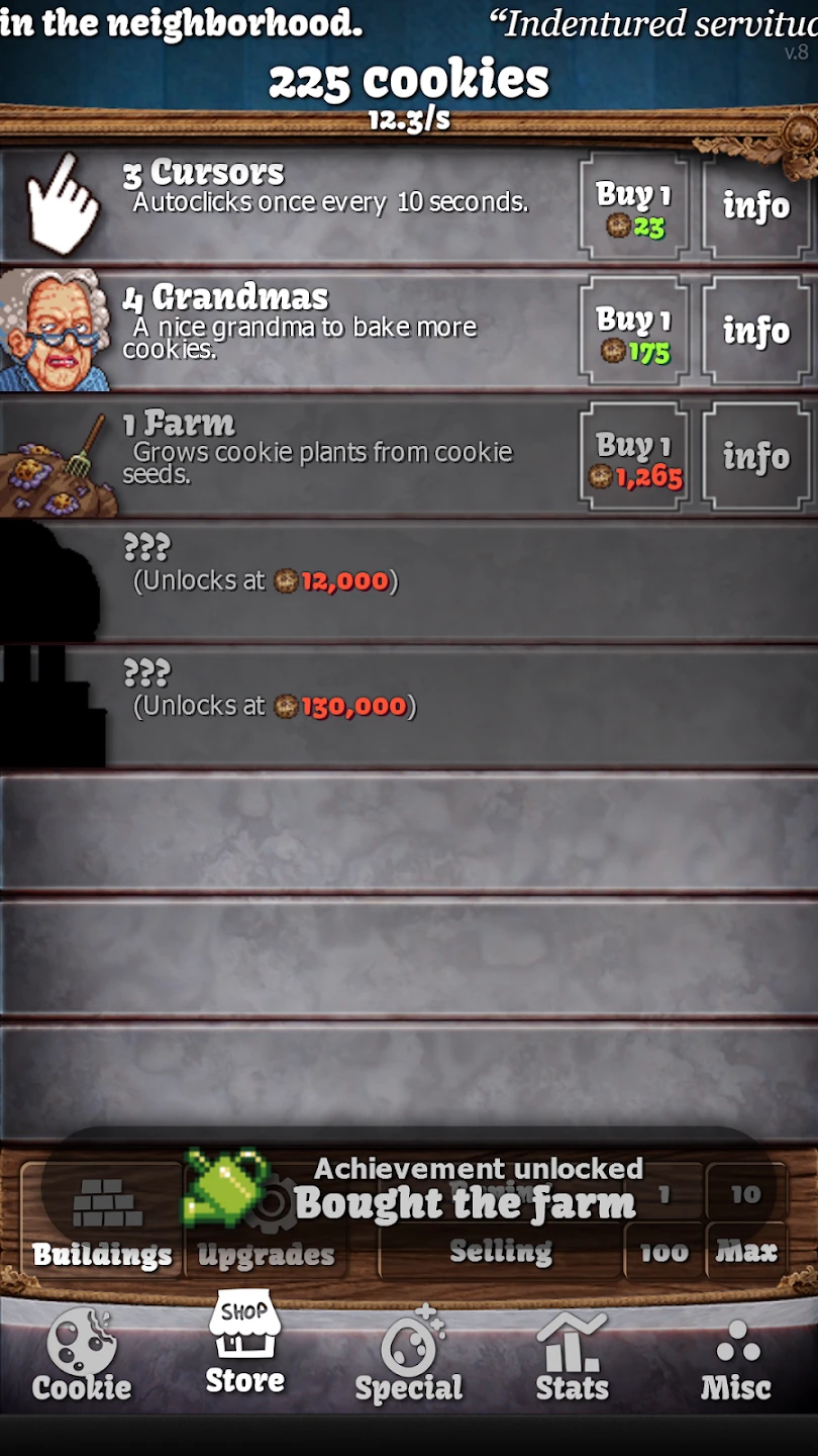 - Step 2: Use your points to buy buildings like cottages or farms, which automatically generate cookies over time, helping you transition from manual clicking.