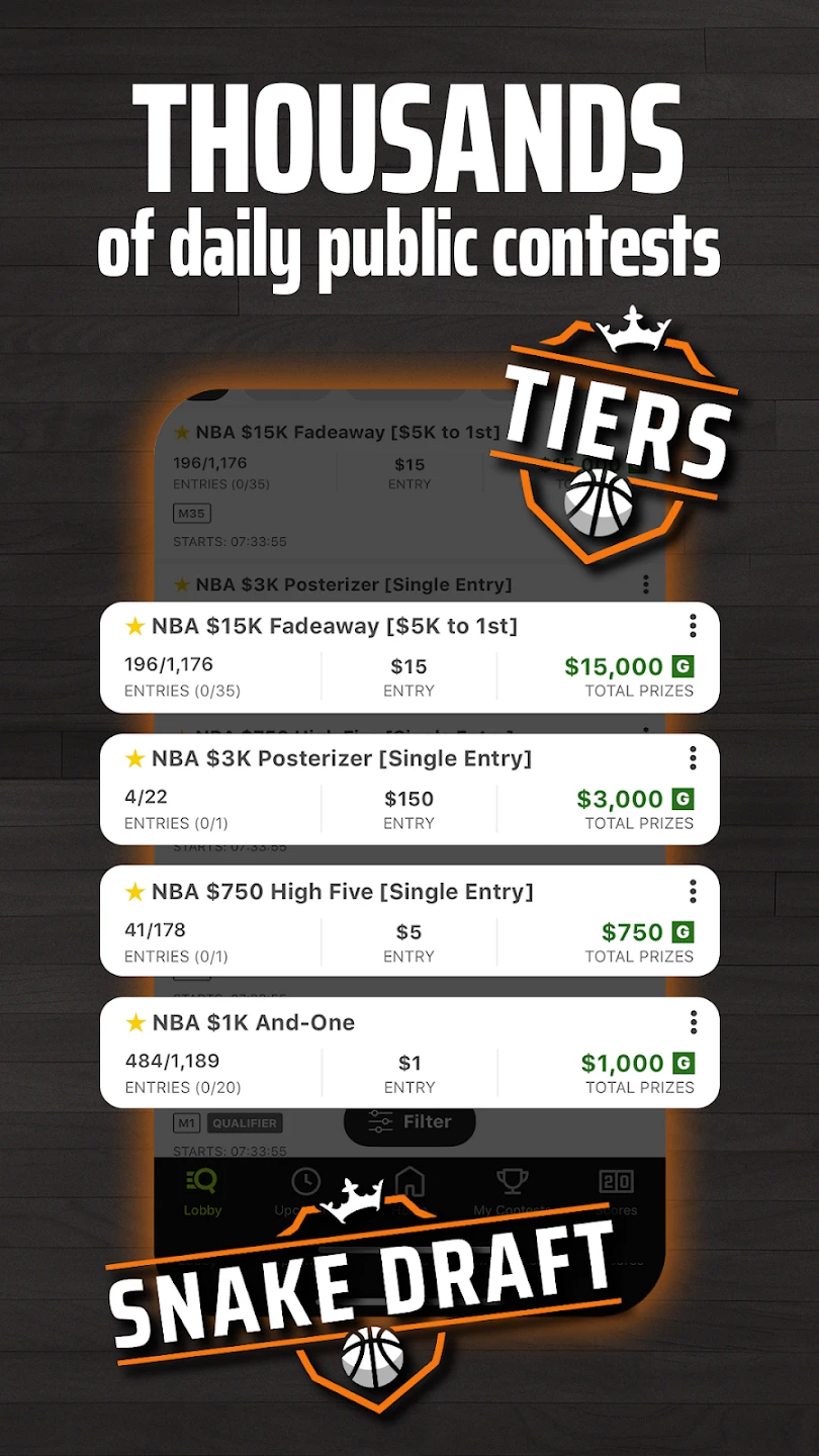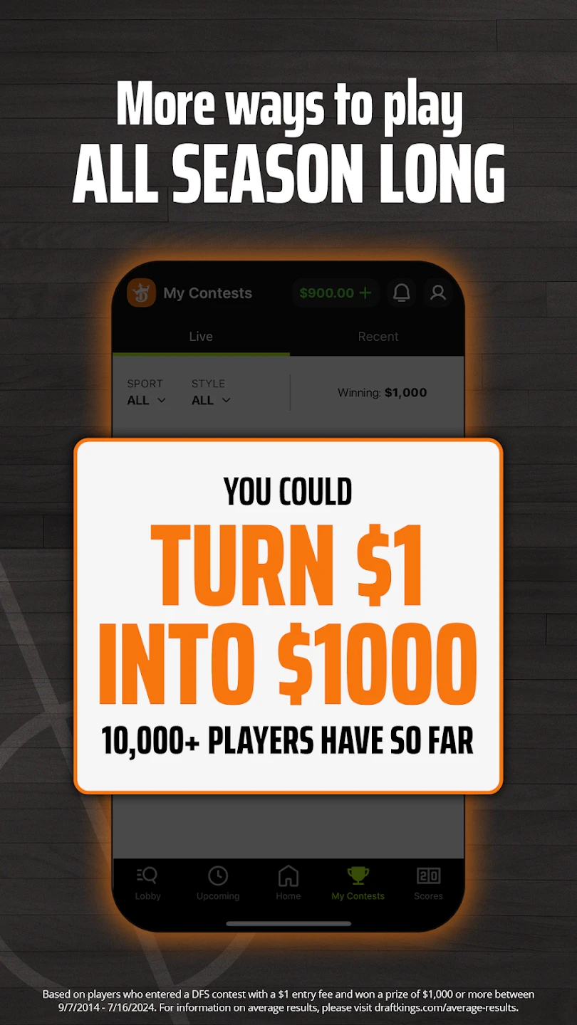A: DraftKings Fantasy Sports offers ‘Daily Fantasy Contests’ typically played for cash prizes or entry-by-pool (entry fee paid from your pool balance) plus, occasionally, legacy ‘Traditional Leagues’. You also access the same DraftKings Fantasy Sports experience from free games if pool size meets the minimum requirement.