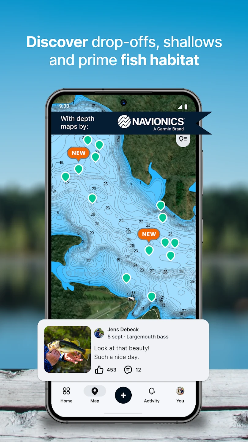 • Offline Mapping: For those epic trips far from signal? No problem. Many regions offer pre-downloaded maps so you can navigate, reference depth contours, explore locations, and even see FBC sightings, all without being online.