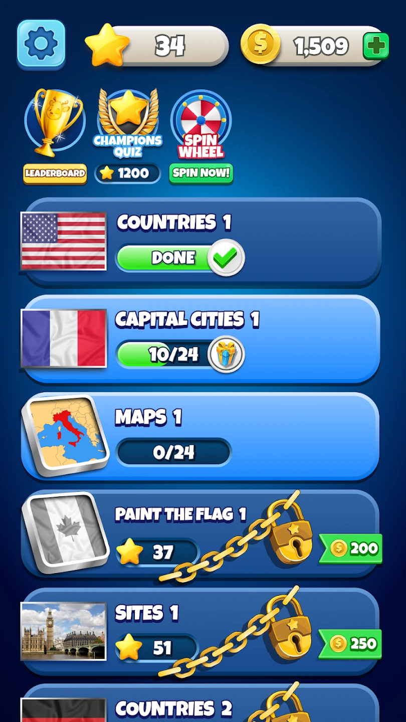 - [Controls or Interface]: On mobile devices (common target), gameplay is touch-based, usually involving swiping to select a country from a displayed list or tapping buttons to choose from multiple answer options. The interface is intuitive and designed for ease of use, with clear visual feedback for correct/incorrect answers. Keyboard controls might apply if available for PC or browser-based versions.