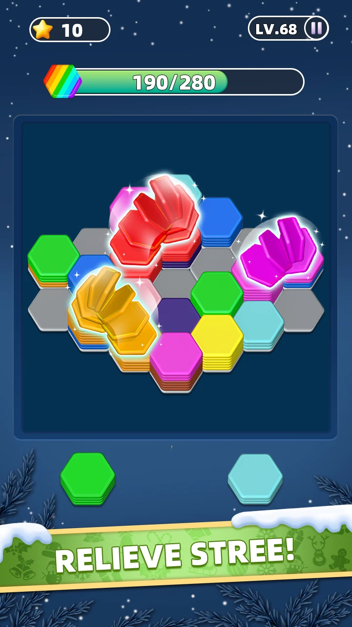 - Step 3: Tap matching colored hexagons to clear them or move them towards the target zone. Earn points for each successful match, chain reactions, and completing levels quickly. Progress through levels, unlocking new themes and challenges as your score increases.