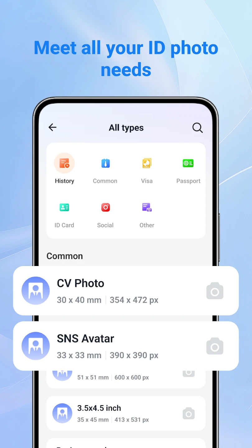 • Easy Photo Upload: Simply select your image from the phone’s gallery or camera roll to get started quickly, bypassing the need for complex manual searches to find the perfect photo. This saves significant time pre-processing, allowing you to focus on getting your ID photos ready faster.