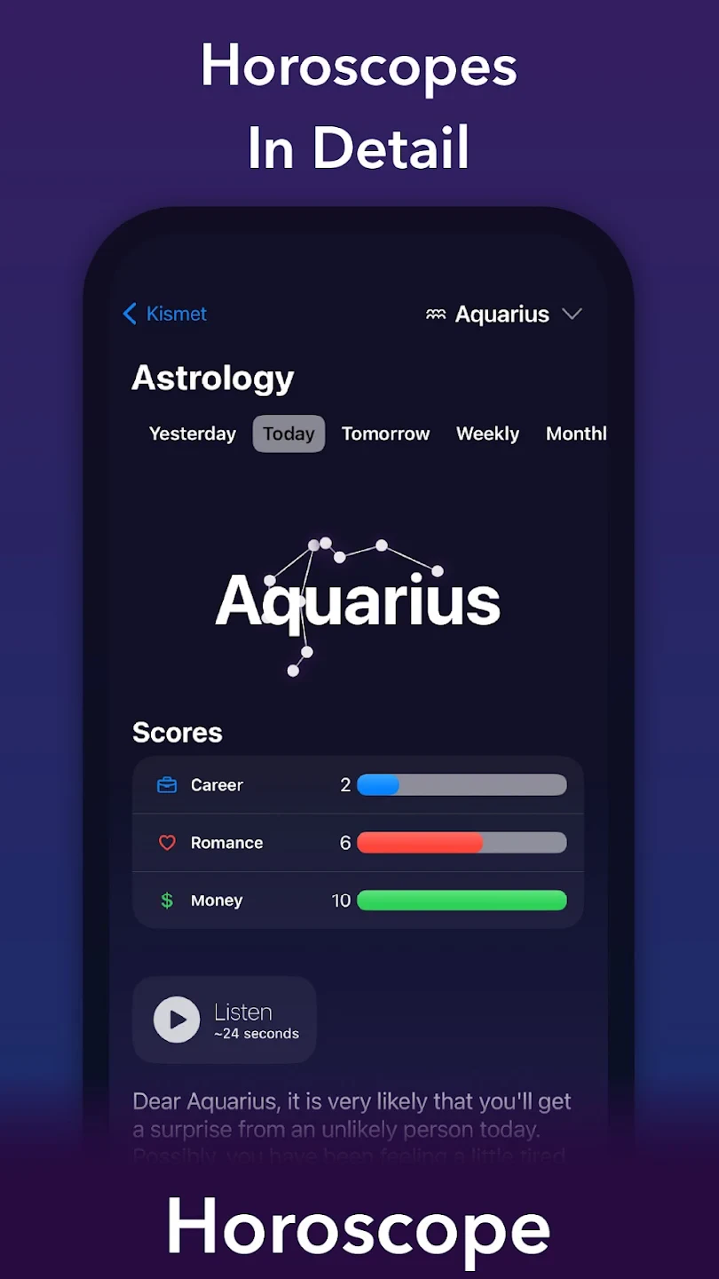 Q: How often is the content in Kismet – Tarot, Astrology updated, such as daily horoscopes?