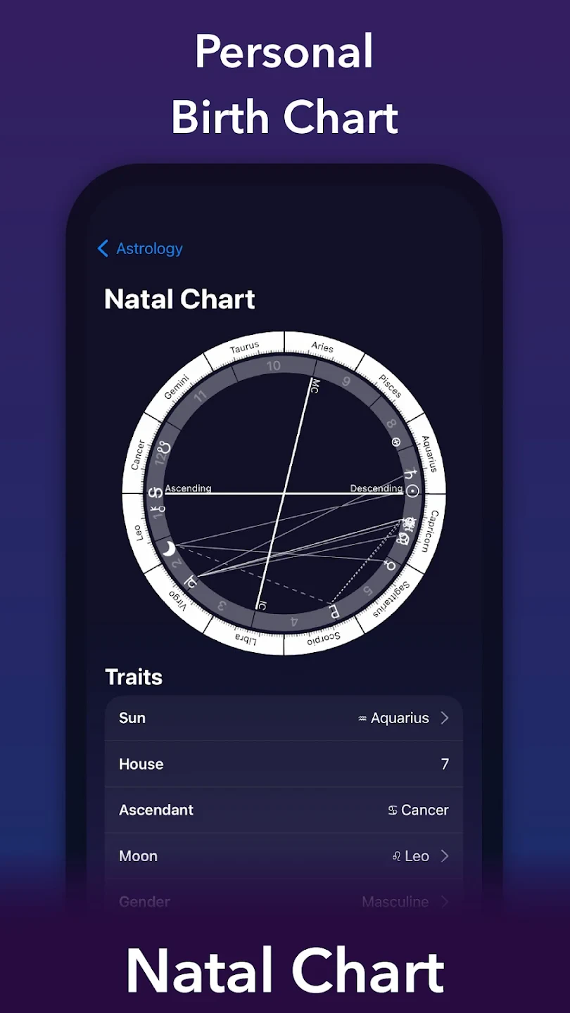 - In-Depth Astrological Chart Interpretation: The app provides detailed interpretations of birth charts and synastry charts, analyzing planetary positions, aspects, and houses to offer insights into personality traits, relationships, and cosmic influences. This feature improves the user’s understanding of themselves or others by leveraging technical terms like planetary archetypes, astrological aspects, and house placements, translating complex information into accessible insights.
