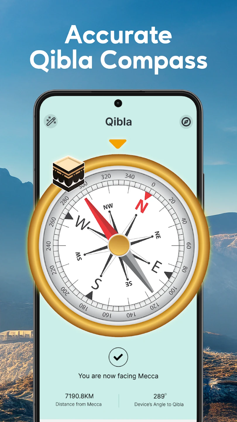 Detailed prayer calculator with mosque finder, Quran reader with multiple recitations, and Islamic articles. |