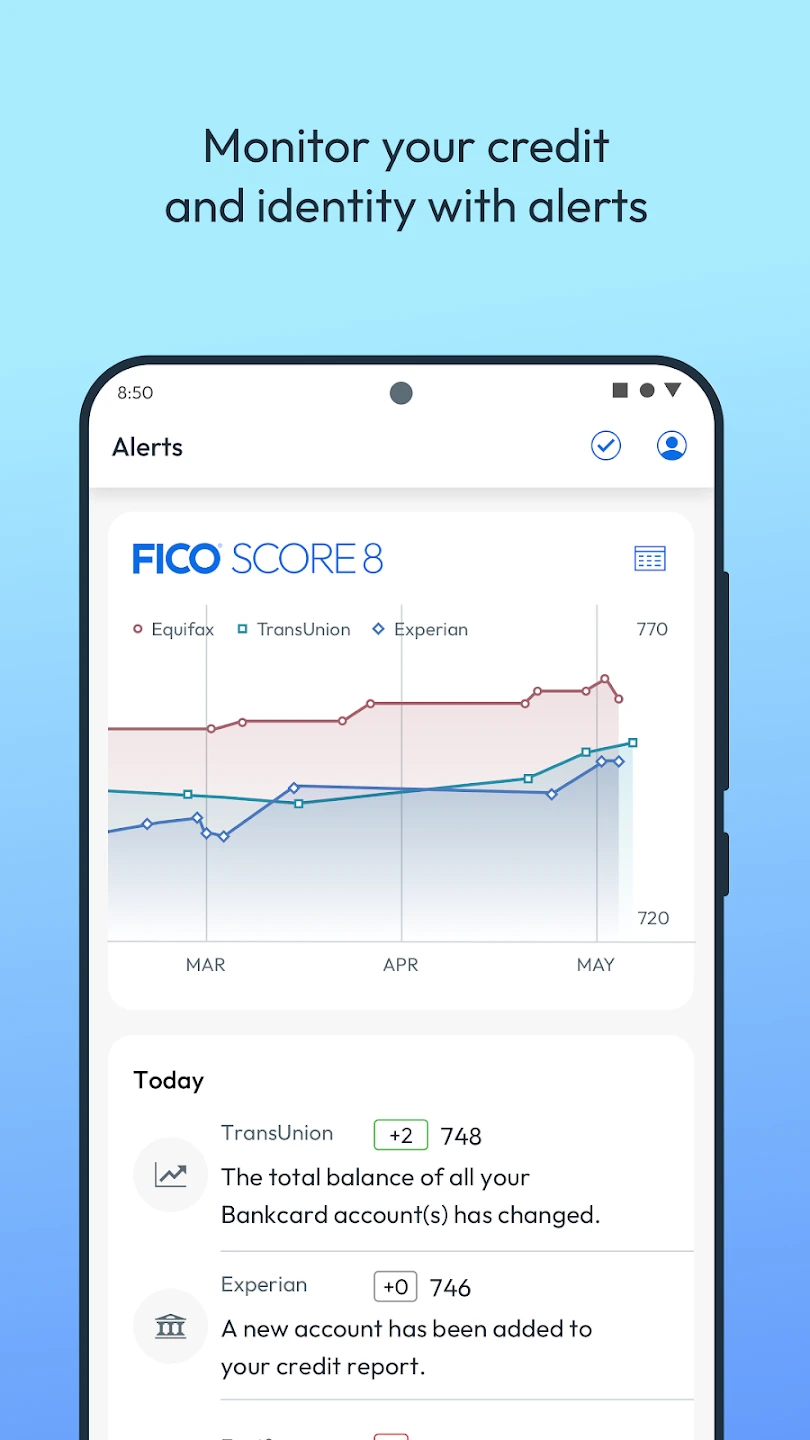 - Credit Score Notifications: Receive alerts for significant changes or drops in your FICO score, helping you stay proactive about potential risks or positive shifts. These timely notifications can prompt users to investigate late payments or fraud more quickly.