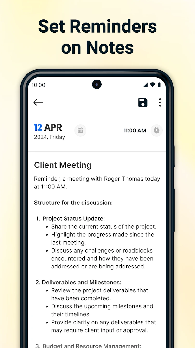 • Auto-Save Mechanism: Automatically save notes as users type, preventing accidental data loss. Key benefits include faster workflows and peace of mind during unexpected interruptions, especially valuable on mobile devices with touch-based input.