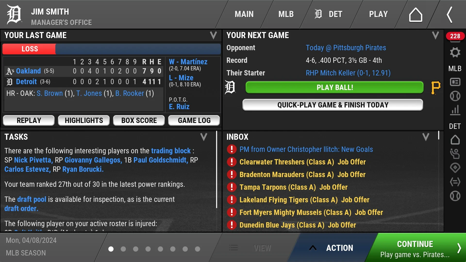 - [Core Gameplay Loop]: Players manage baseball teams through simulated seasons, making strategic decisions during games and between contests. The objective is to build a winning team by recruiting talent, training players, and outsmarting opponents through calculated choices during the gameplay.