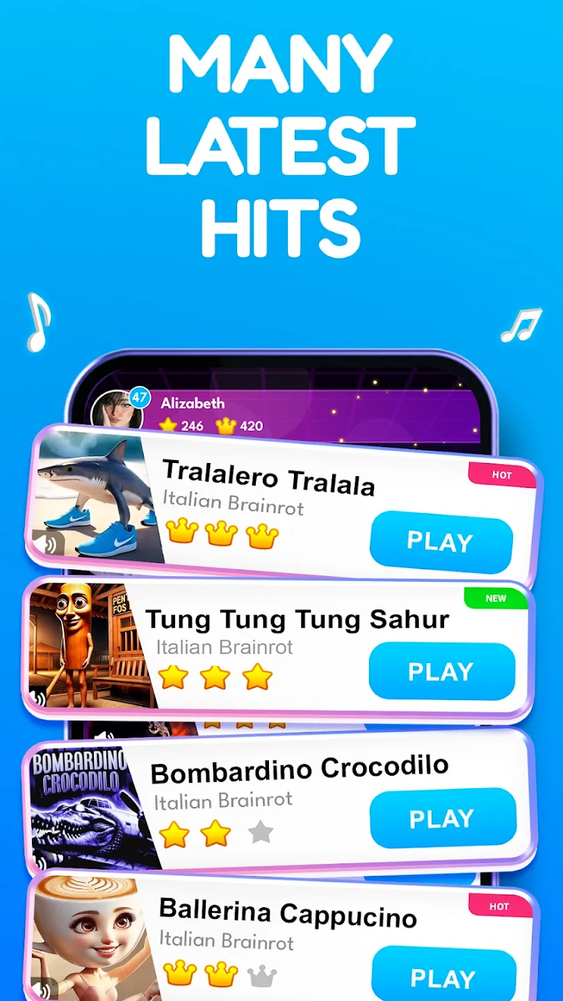 - [Customization or Power-ups]: Progression unlocks new instruments and difficulty settings, while an in-game shop offers customization options for the piano appearance. Motivators include achievement badges, performance stats tracking, and seasonal event items that encourage ongoing play.