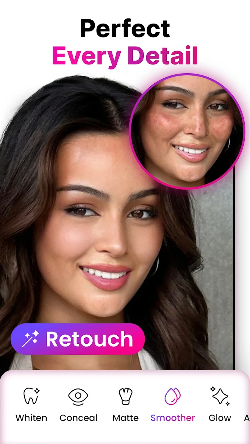 • AI-Powered Face Retouching: This feature automatically detects facial elements like skin, eyes, and hair, intelligently smoothing skin texture while preserving natural features and details. This allows for a flawless finish in seconds, perfect for quickly enhancing portrait photos for social sharing.