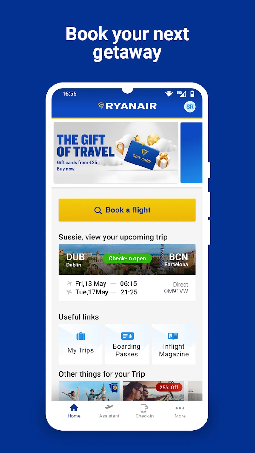 - My Trips Dashboard: Instantly view and manage all upcoming Ryanair flights, with details on check-in status, baggage allowances, and alternative reroutes if disruptions occur mid-journey.