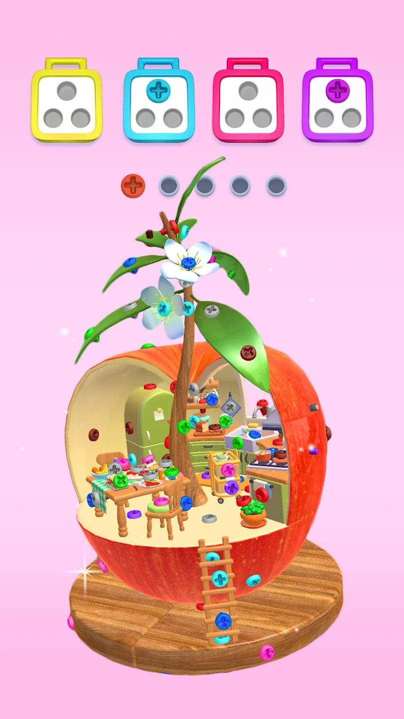 - [Visuals or Art Style]: The game features clean, minimalist, and polished 3D graphics with a pleasing color palette. Objects like screws and pins are clearly defined, allowing players to easily distinguish parts and visualize the puzzle environment, enhancing the spatial reasoning experience.