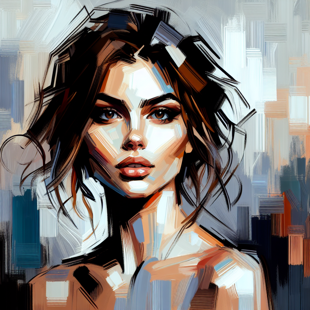 An assertive young woman with brunette hair and charming features in the tone of abstract expressionism. This artwork emphasizes free, vigorous brushwork, non-representational subject matter, and highly expressive, emotional content.