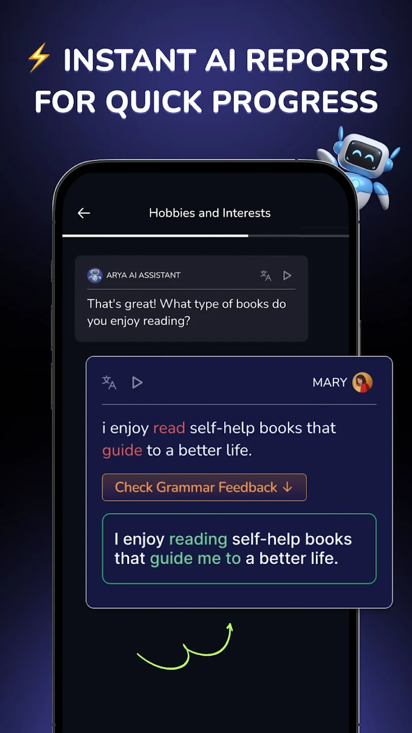 - Real-time Pronunciation & Fluency Feedback: Record your responses and use the app’s analysis tools to receive insights on your pronunciation accuracy and speaking speed. It breaks down feedback into understandable points, pinpointing areas for improvement and helping users develop more accurate intonation patterns over time.