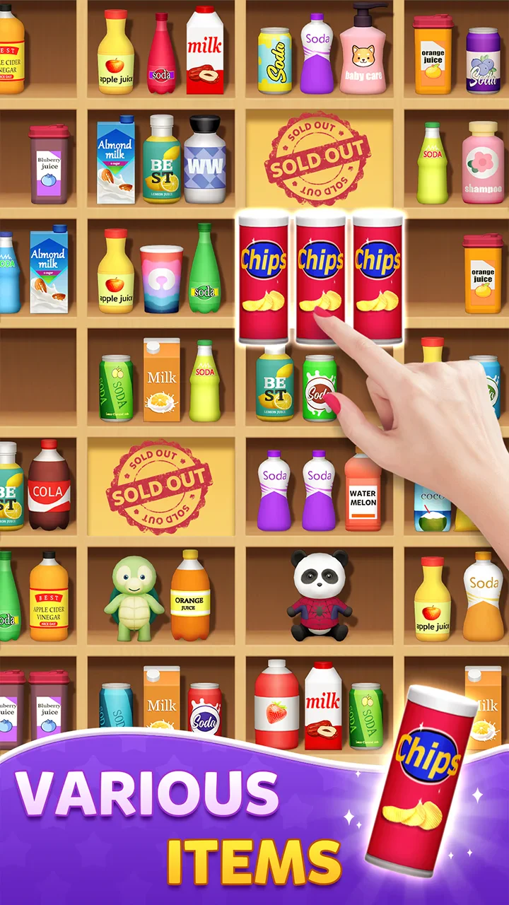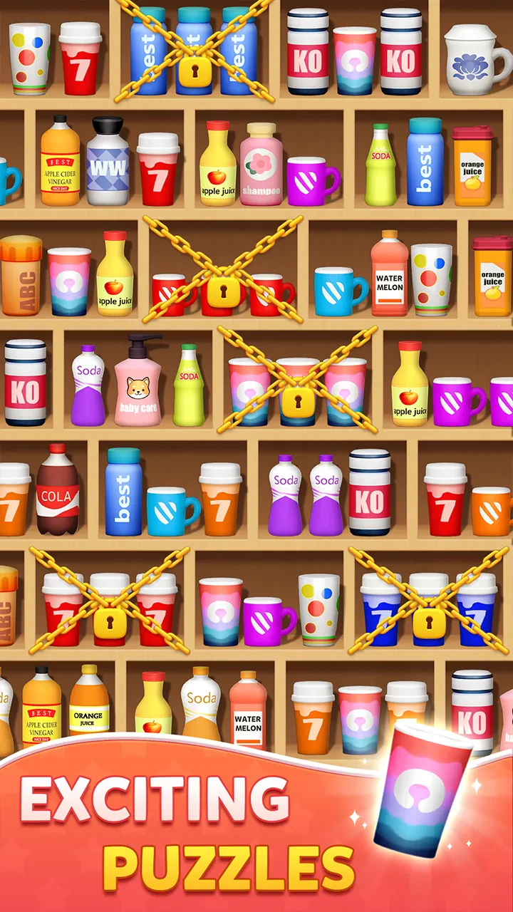 • [Visuals or Art Style]: Sort Match:3D Goods Master features bright, colourful graphics and high-quality 3D models of goods (fruit, toys, tools, etc.). The design uses a stylized look combined with smooth animations and particle effects, creating a vibrant and immersive visual experience.