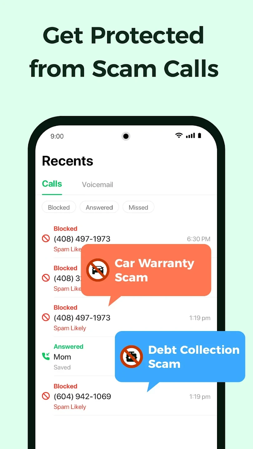 Provides real-time caller ID and automatic scam detection with the ability to report and verify questionable numbers. |