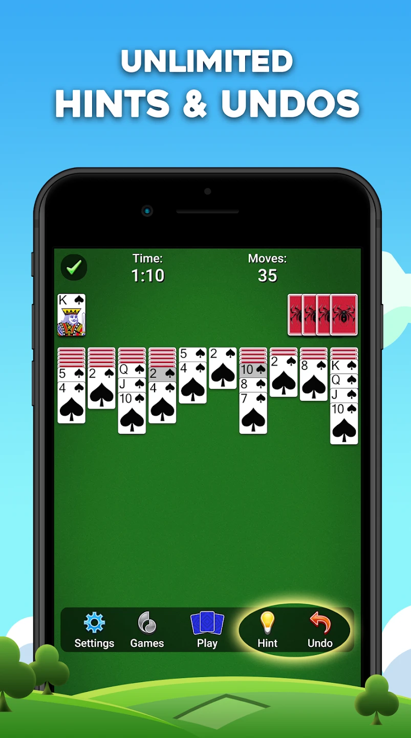 • [Customization or Power-ups]: Standard Spider Solitaire doesn’t heavily feature power-ups, customization options, shops, or progression systems beyond difficulty levels and potentially earned achievements or score leaderboards. Motivation for ongoing play comes from beating higher levels, clearing difficult layouts, achieving speed records, or unlocking potentially cosmetic elements like card back designs.