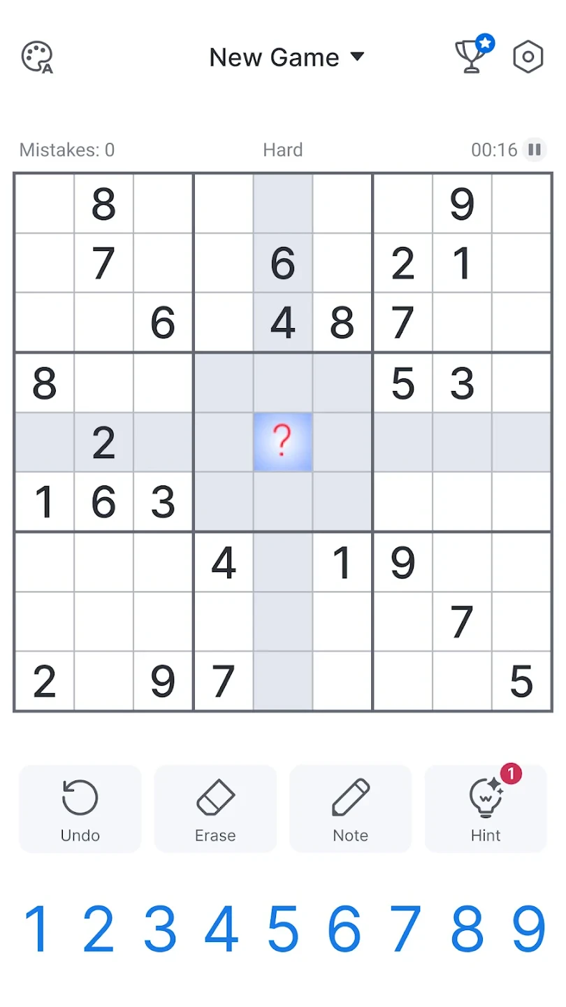 • Step 2: Click empty cells and enter numbers, using the number selection pad. The app highlights the entire column and 3×3 square to show where the number already appears.