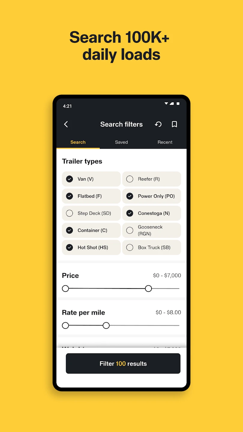 Offers real-time load matching with customizable filters. Includes fuel cost comparison and trip planning. Known for its intuitive UI with minimal learning curve. |