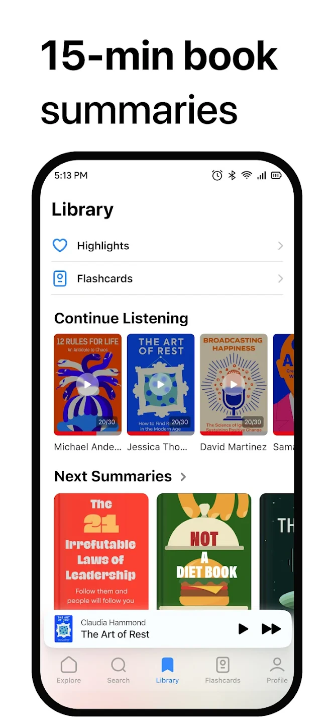 • Curated Daily Selections & Playlists: Wiser – 15 minutes Audio Books provides daily recommendations featuring the most popular or newest audio content. It also includes thematic playlists like ‘Morning Motivation’ or ‘Learning Spanish’. This intelligent curation significantly enhances usability by guiding users towards quality content they might discover otherwise, saving time and ensuring a good listening experience.