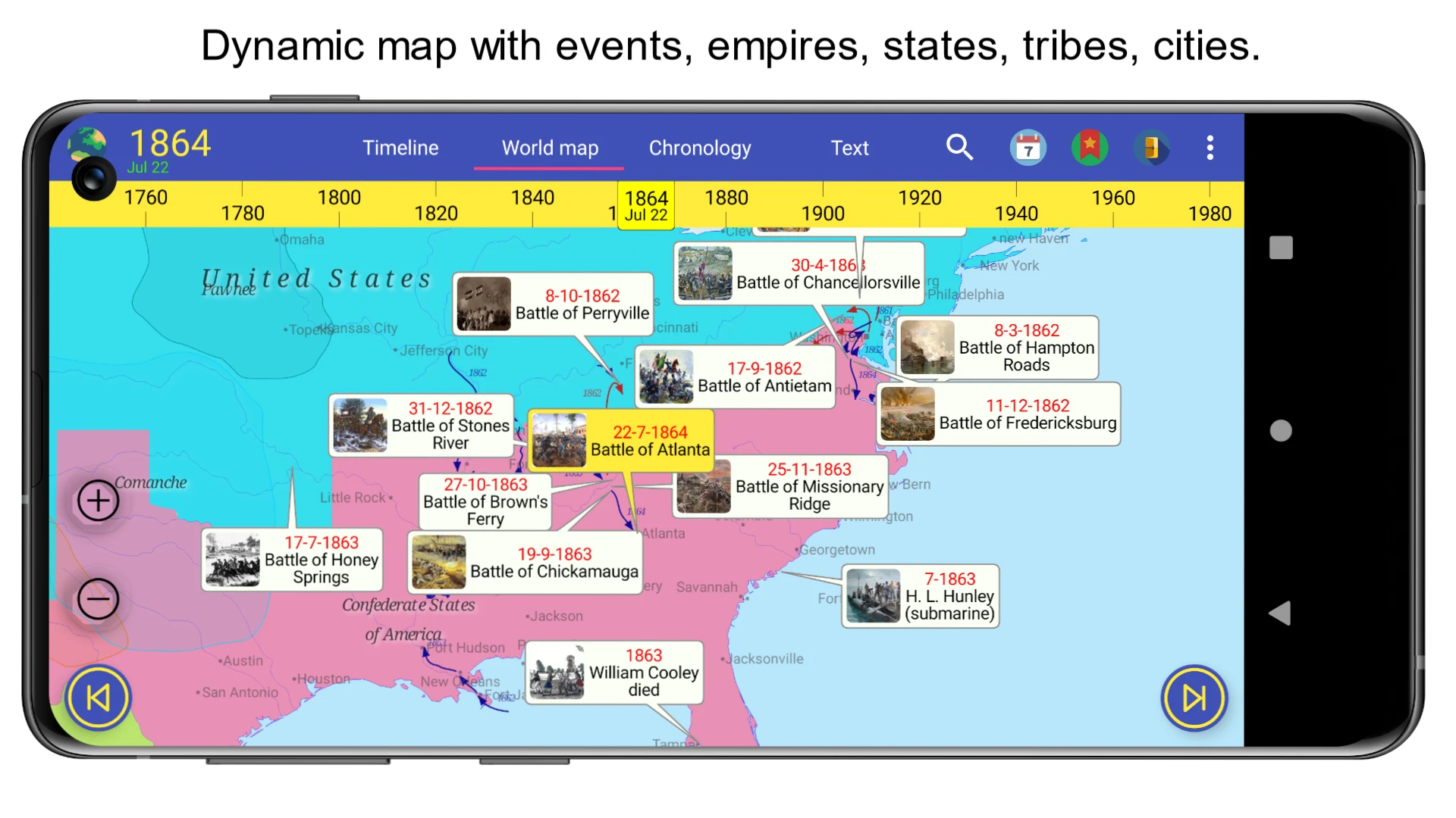 • Detailed Event & Place Information: Tap on any point in time or space on the map or timeline to retrieve rich, multimedia content—including primary source documents, scholarly articles, images, and bibliographies—directly tied to that specific historical occurrence or location, providing immediate context and supporting deeper research with credible sources.